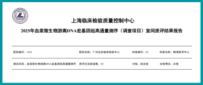 Recently, the Shanghai Center for Clinical Laboratory Quality Control released the "2025 Inter-Laboratory Quality Assessment Results Report for Plasma Microbial Cell-Free DNA Metagenomic High-Throughput Sequencing (Survey Project)". YunKang Group · Guangzhou DaAn Clinical Laboratory achieved excellent results in this EQA, once again confirming its technical stability and quality management level in the field of metagenomic next-generation sequencing (mNGS) for pathogenic microorganisms.